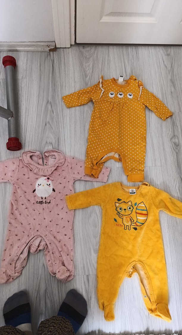 Nakışlı ve örgü detaylı, sarı ve pembe tonlarda renkli bebek kız tulumları, eğlenceli hayvan desenleriyle.