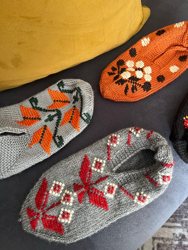 Çok renkli nakışlı çiçek desenleriyle gri taban üzerinde örülmüş kadın terlikleri. Rahat, kama topuklu ve günlük kullanıma uygun, bohem ve retro tarzda.