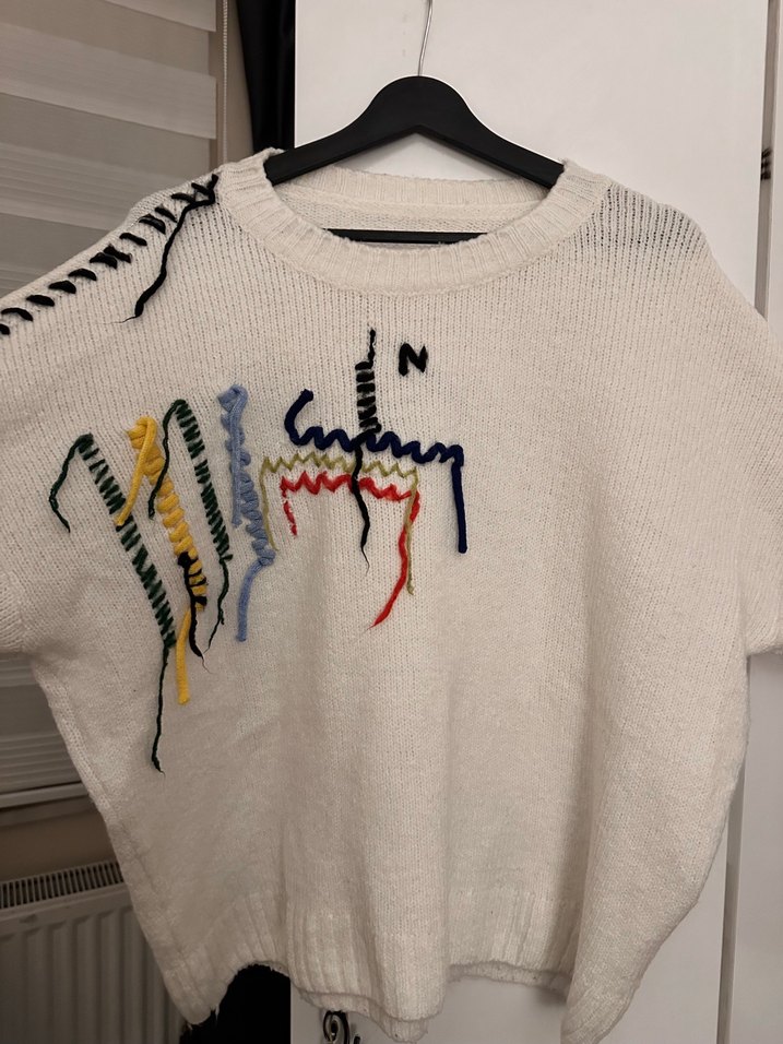 Beyaz örgü kazak, yuvarlak yaka ve uzun kollu, renkli nakış detaylarıyla bol kesim, bir sorunu yoktur