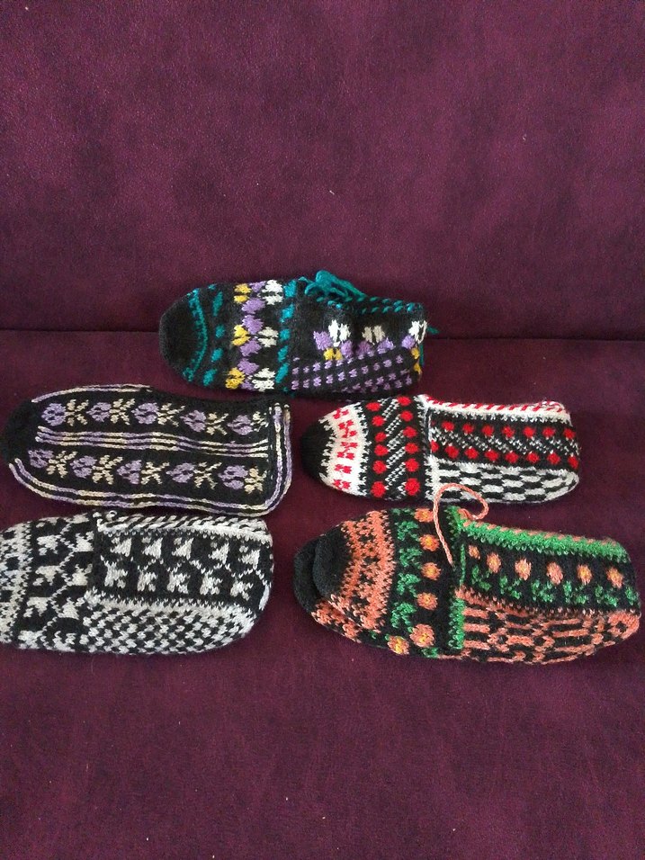 Nakışlı desenlere sahip örgü kumaştan yapılmış, koyu renkli çok renkli kadın ev terlikleri. Dolgu topuklu ve bohem, retro tarzını yansıtıyor. tane fiyatıdır