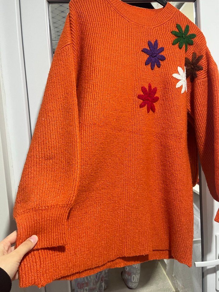 Kahverengi örgü kadın kazak, bol kesim, uzun kollu ve yuvarlak yakalıdır. Renkli nakışlı çiçek detayları bohem bir hava katar. Günlük kullanıma uygundur.