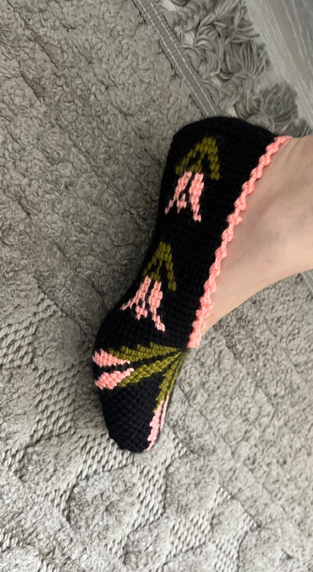 Nakışlı çiçek desenli, örgü kadın terlikler. Koyu çok renkli, kama topuklu ve rahat, geleneksel tarzda günlük kullanıma uygun.