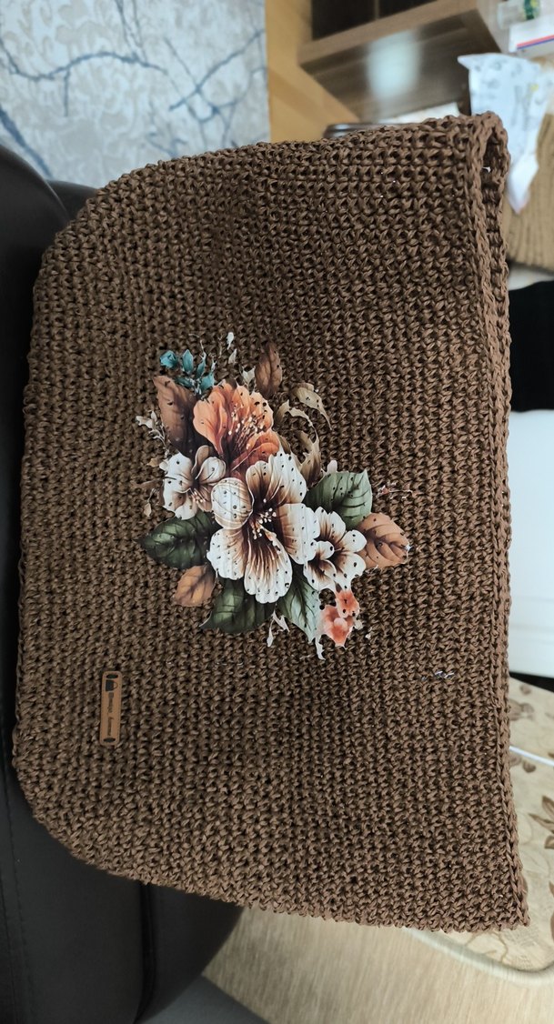 Koyu kahverengi örgü kadın çanta, nakışlı çiçek desenleriyle rahat ve bohem tarzı bir araya getiriyor.