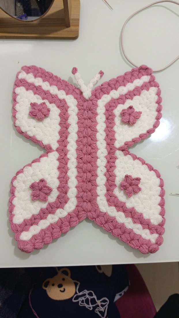 Pembe ve beyaz renklerde, nakışlı detaylara sahip kelebek şekilli örgü çocuk battaniyesi, yumuşak ve rahat bir doku sunar.