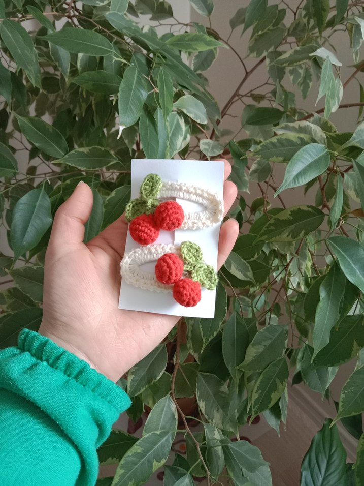 Nakışlı kiraz ve yaprak detaylı örgü çocuk saç tokaları, bohem tarzda ve renkli tasarıma sahip. çift fiyatıdir