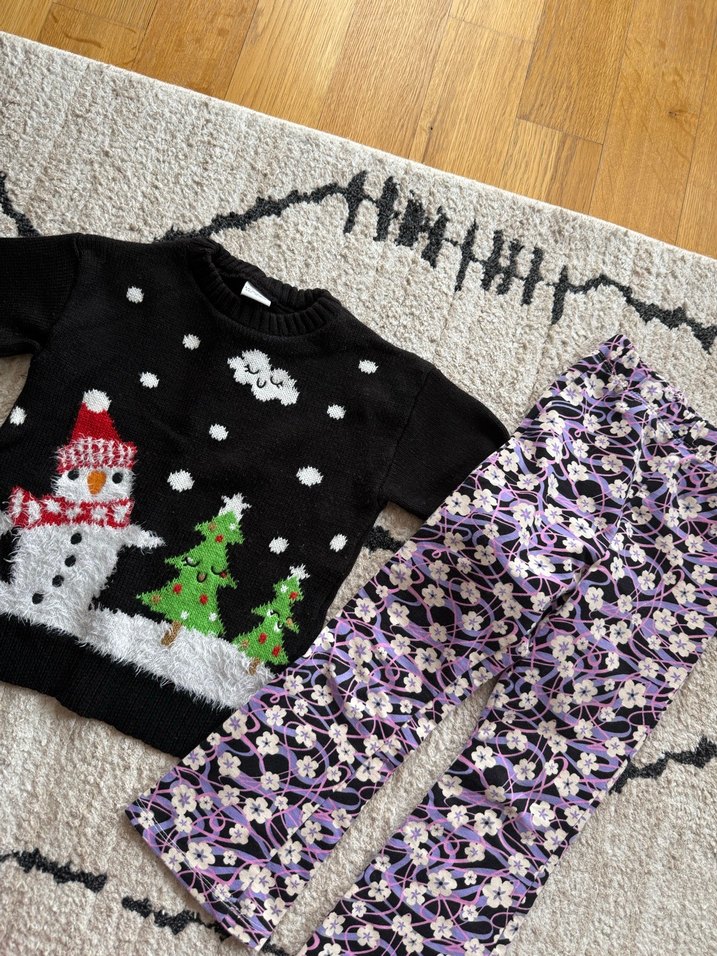 Nakışlı kar ve ağaç desenli örgü uzun kollu üst ile çok renkli çiçek desenli pantolonlu kız bebek takımı. ❄️ 3-4 yaş kazak hiç giyilmedi