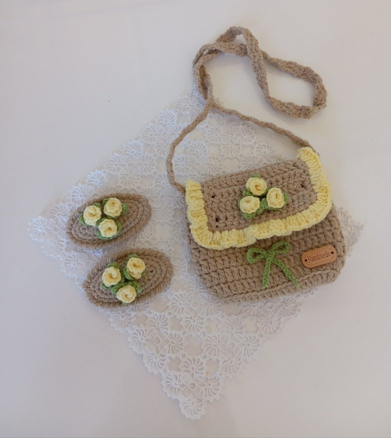 Nakışlı çiçek detaylı, pastel sarı kenarlı bej renk örgü kız çocuk çanta ve toka seti, bohem tarz için uygun. 2 4 yaş kız çocuk için uygundur.