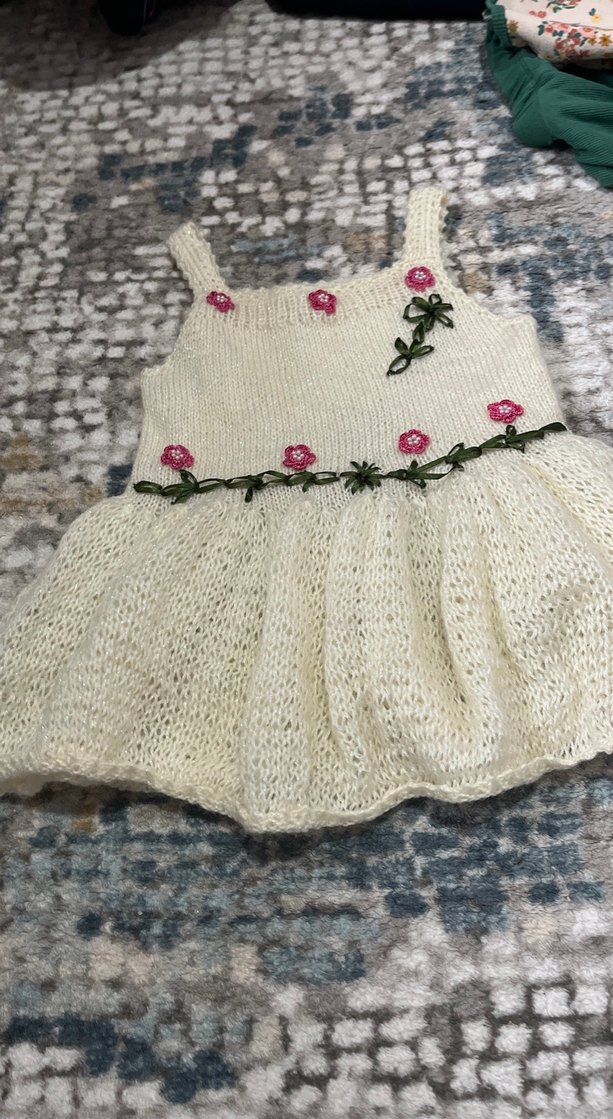 Askılı, straplez ve bol kesim kız çocuk elbisesi, örgü kumaştan yapılmıştır. Nakışlı pembe çiçekler ve yeşil yapraklarla süslenmiştir, bohem tarzını yansıtır.