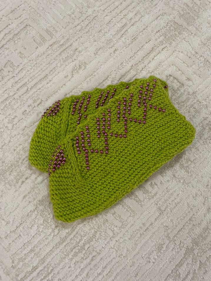 Yeşil renkli, nakışlı detaylara sahip örgü kız çocuk ev terliği. Bohem ve retro tarzında, yumuşak örgü dokusuyla sıcaklık ve rahatlık sağlar.