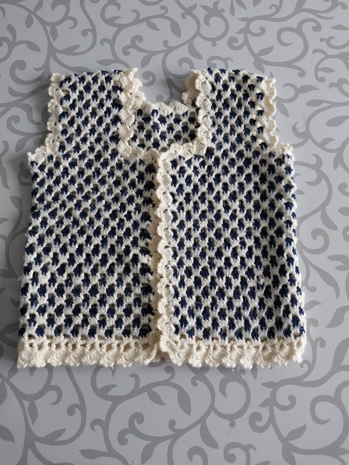 Nakışlı desenli, örgü kumaştan yapılmış, bisiklet yaka ve kolsuz kız çocuk yeleği. Beyaz ve gri renklerde, normal kesim.