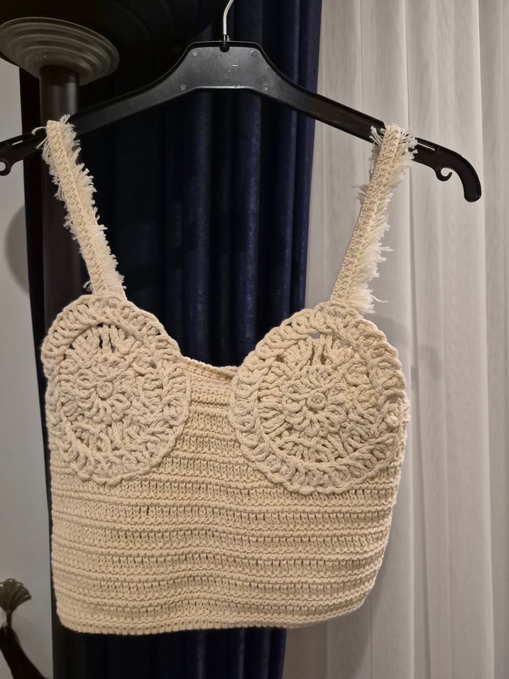 Nakışlı detaylara sahip krem rengi örgü büstiyer, askılı ve straplez tasarımla bohem stile uygun, kısa ve vücuda oturan kesimdedir.