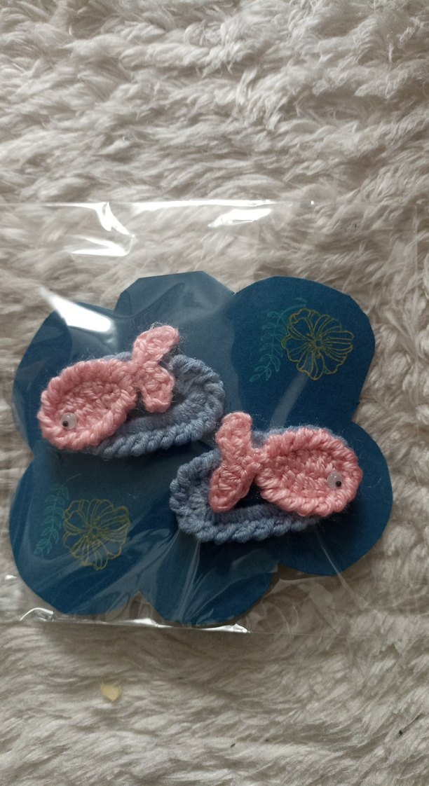 Nakışlı pembe balık detaylı, pastel mavi örgü çocuk saç tokaları, bohem tarzını yansıtır.