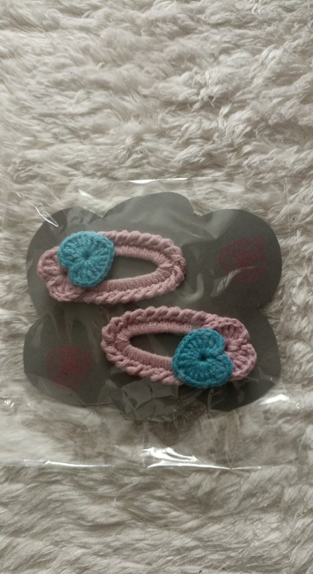 Nakışlı mavi kalpli, örgü pembe saç tokaları çocukların saçlarına bohem bir dokunuş katıyor.