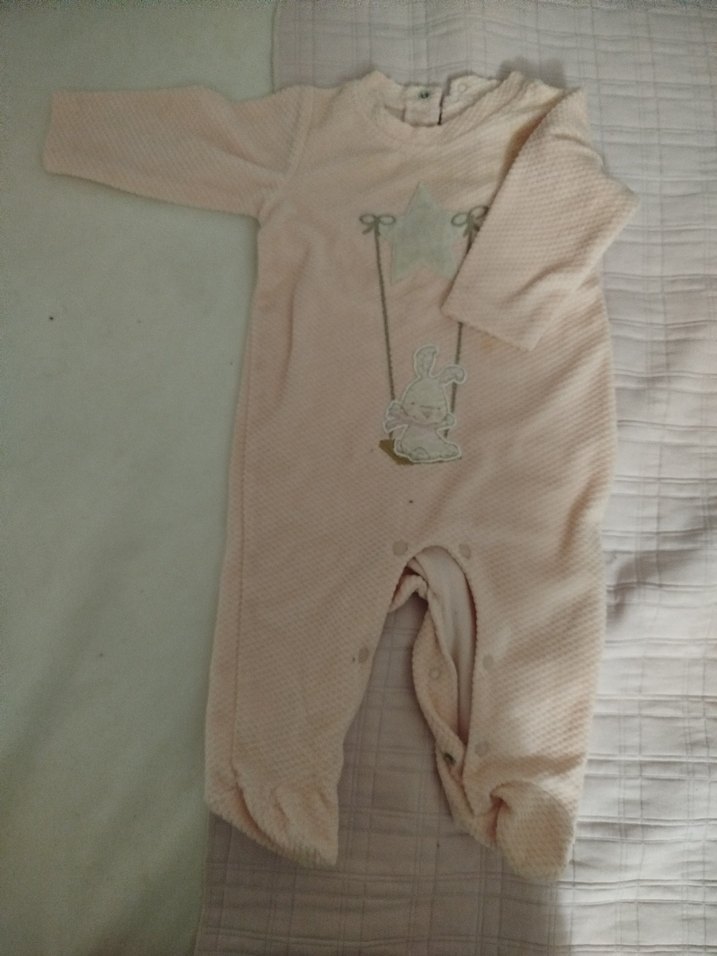 Uzun kollu ve ayaklı, yumuşak pembe örgü bebek tulumu, nakışlı detaylarla süslenmiştir.