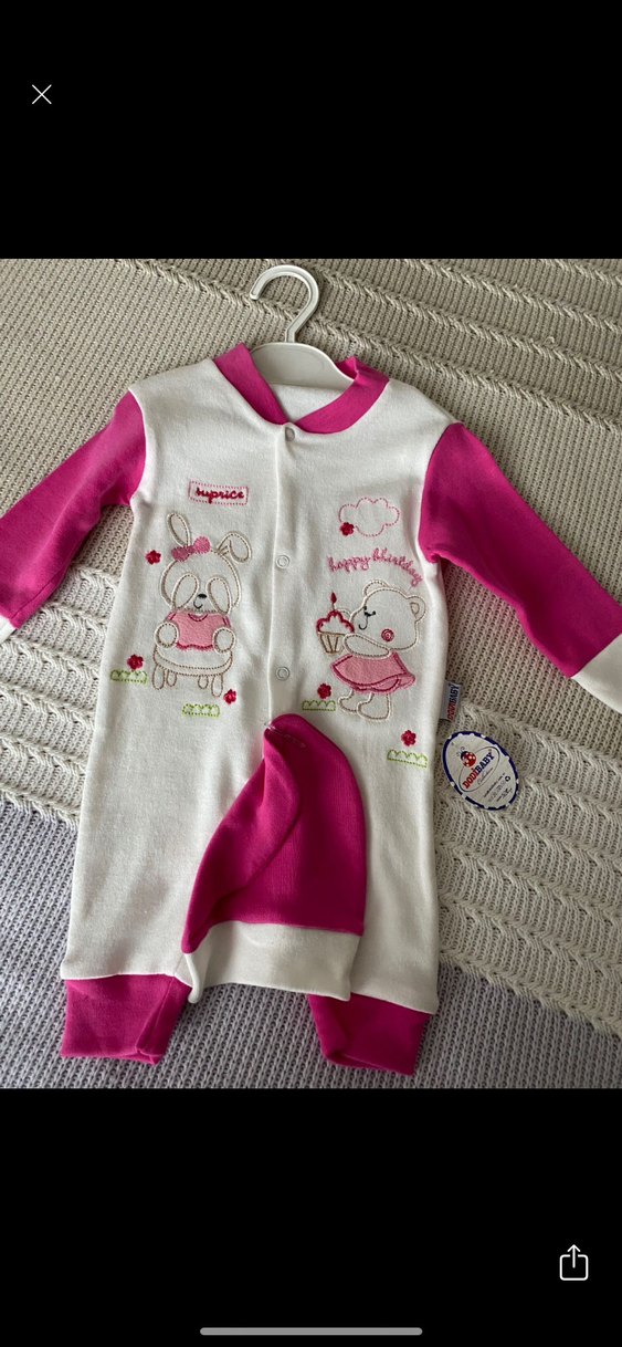 Etikette 6 ay yazıyor 3-6 aylık Renkli pembe örgü kumaştan, nakışlı hayvan desenli bebek tulumu. Kolay giydirme için çıtçıtlı, şapkalı set.