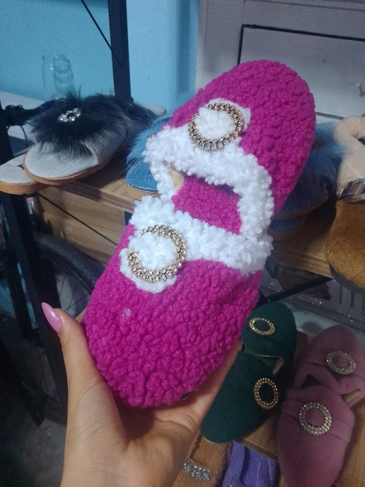 Yumuşak, rahat dokuda, nakışlı ve yüksek topuklu örgü pembe kadın ev terliği. Günlük kullanım için şık bir seçenek.
