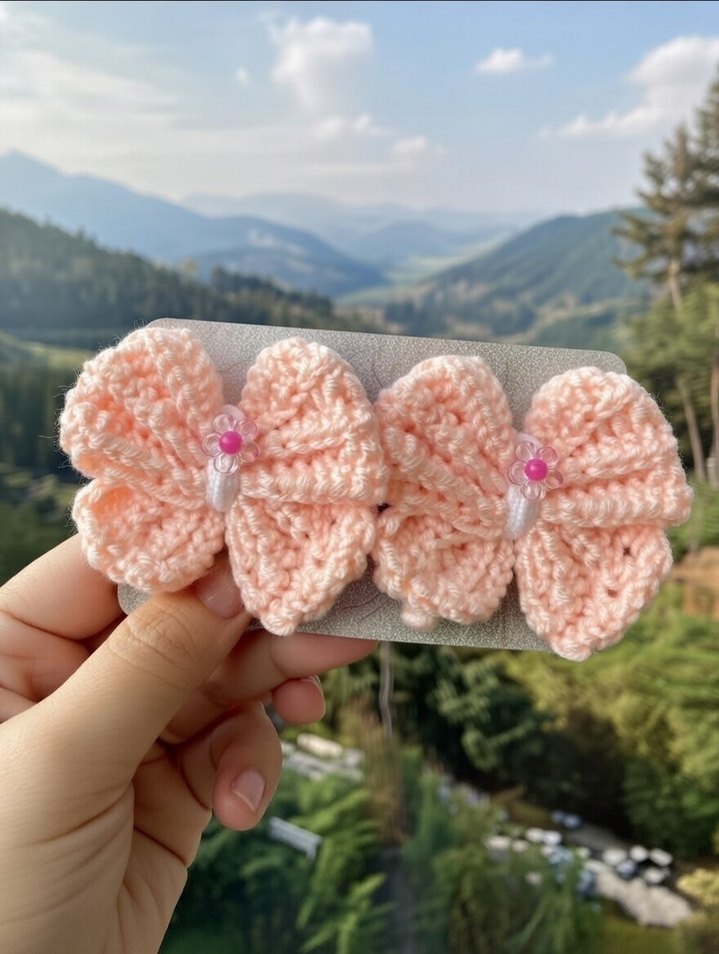 Pastel pembe renkli, nakışlı kelebek desenli örgü çocuk saç tokaları, boncuk detaylarıyla bohem tarzı sunar.