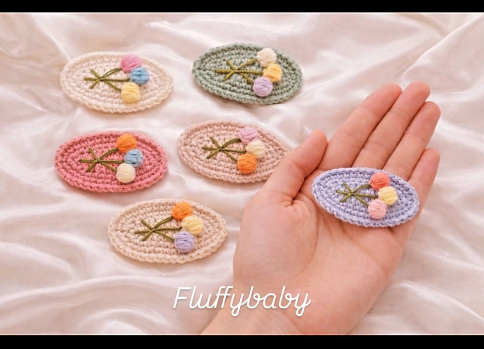 Nakışlı çiçek desenli, pastel renklerde örgü çocuk saç tokaları. Bohem tarz için uygun. Marka: Fluffybaby