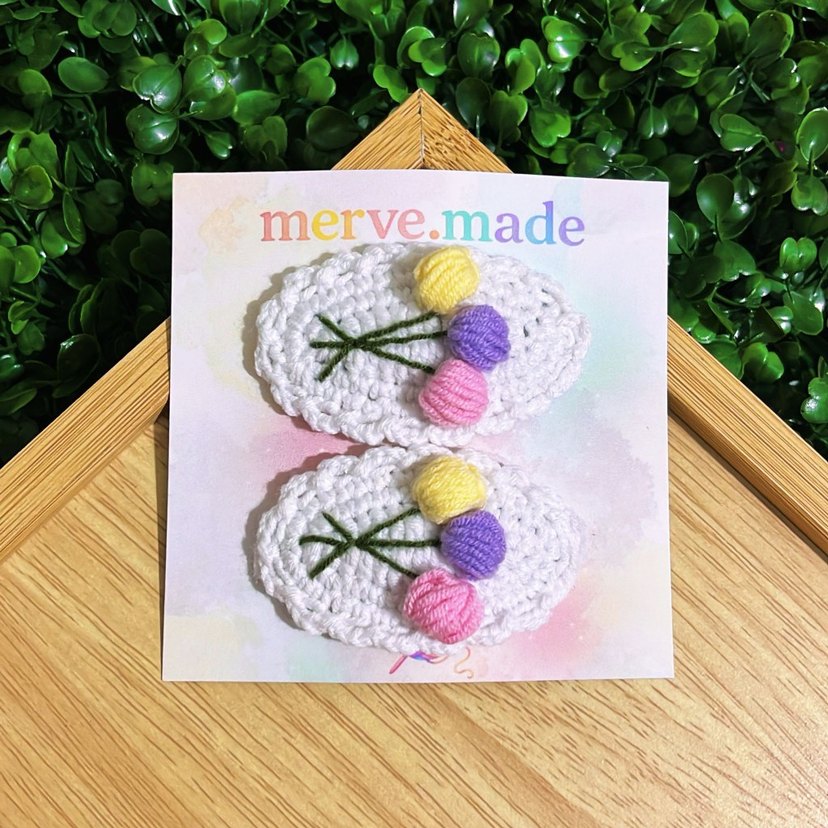 Nakışlı çiçek detaylı, renkli örgü çocuk tokaları. Bohem tarzı için uygun. merve.made tarafından el yapımı.