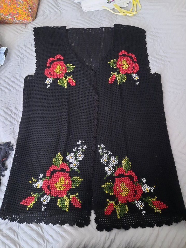 Nakışlı çiçek desenleriyle süslü, askısız ve kolsuz siyah örgü yelek, bol kesim ve bohem tarz sunar. Yeni örülmüştür. Hiç kullanılmamıştır. 50 bedene kadar rahatlıkla olur