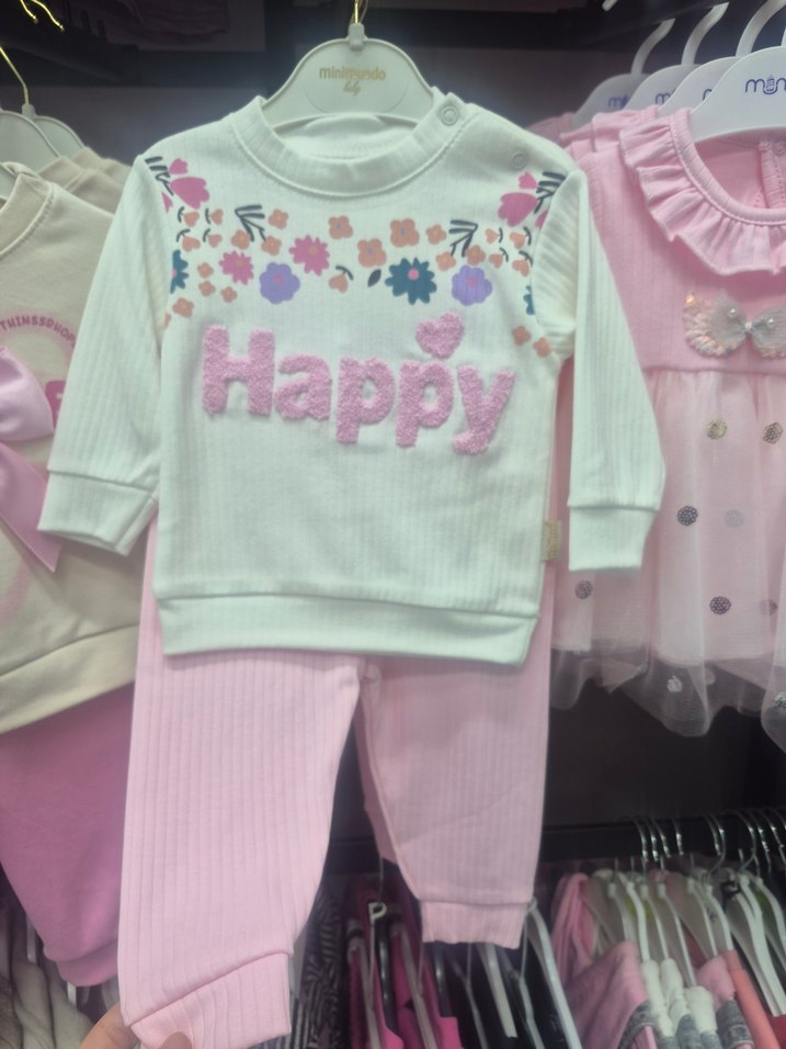 Nakışlı çiçek desenli ve "Happy" yazılı örgü uzun kollu üst ile pastel pembe ribanalı pantolonlu bebek kız takımı.