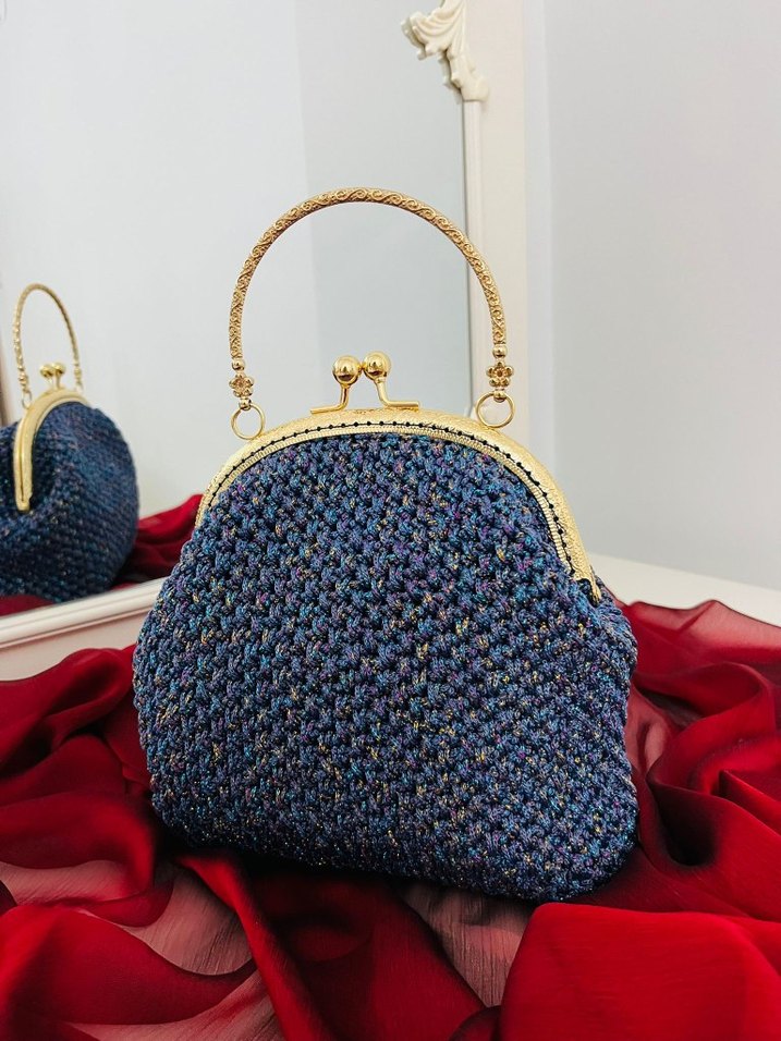 gold detaylara sahip renkli mavi örgü kumaştan vintage tarzda kadın çanta. Altın renkli tokası ve sapı var, günlük kullanım için uygun. iç astarlı- el örgüsü