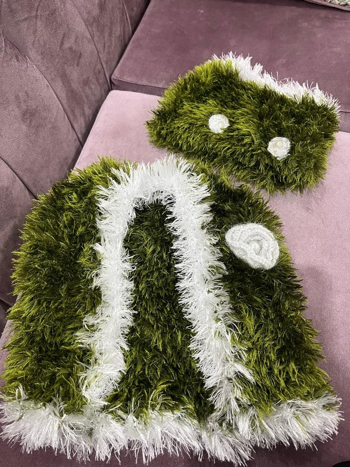 Nakışlı ve örgü dokuda, bohem tarzda yeşil ve beyaz renkli kız çocuğu yelek bere takım. alıcısına hayırlı olsun