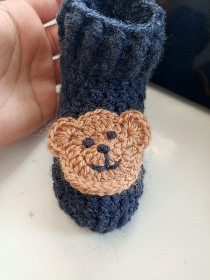 Gri örme kumaştan, kahverengi nakışlı ayıcık yüzlü bebek botu. Yumuşak ve sıcak tutan tasarım. sipariş alınır renk ve farklı istenilen model yapilir