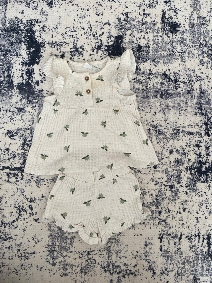 Örme, kolsuz beyaz bebek kız takımı, gri nakışlı çiçek desenleriyle. Düğmeli üst ve volanlı şort içerir.
