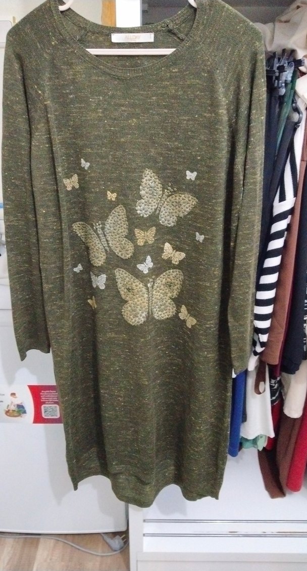 Bol kesim, uzun boy, uzun kollu ve yuvarlak yaka örme tunik, nakışlı kelebek desenleriyle rahat bohem tarzda. Günlük kullanıma uygun.