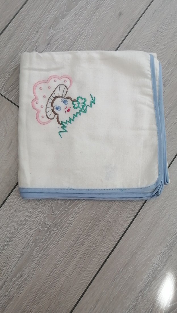 Beyaz renkte, pastel nakış detaylı, pamuk kumaştan yapılmış, mavi kenarlıklı çocuk battaniyesi.