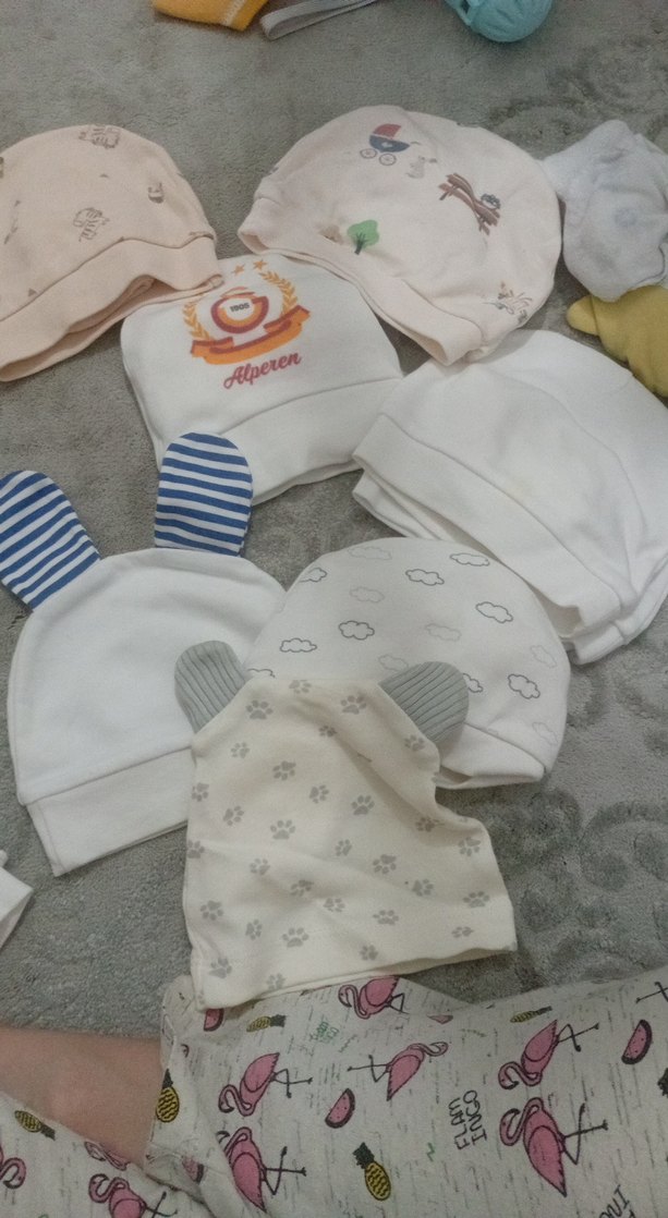 Nakışlı desenlere sahip, pastel renklerde yumuşak pamuk bebek şapkaları. 10 adet var eldivenle bulunuyor almadan önce yazınız tek de sayabilirim