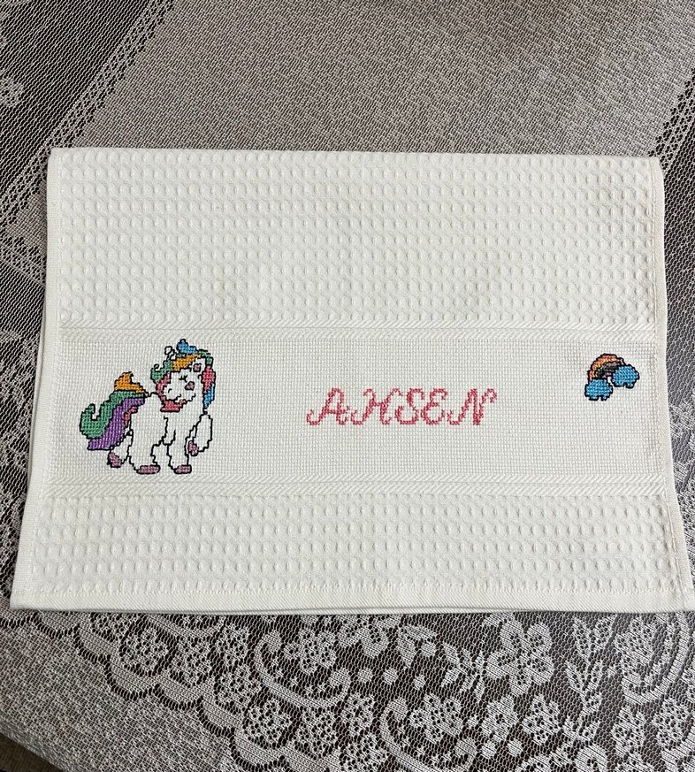 Nakışlı unicorn figürleri ve ortada "AHSEN" ismi bulunan beyaz pamuk çocuk havlusu. Yumuşak ve nefes alabilir kumaş. Sipariş alınır.