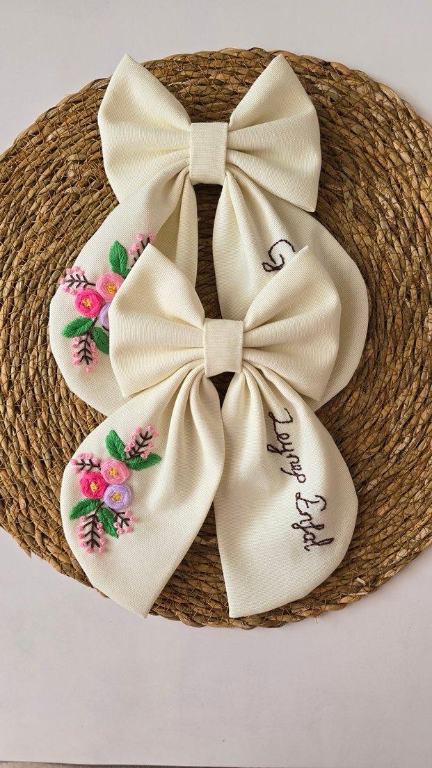 Nakışlı çiçek detaylı, pamuklu beyaz fiyonk saç tokaları, bohem ve retro Parisian tarzına uygundur.