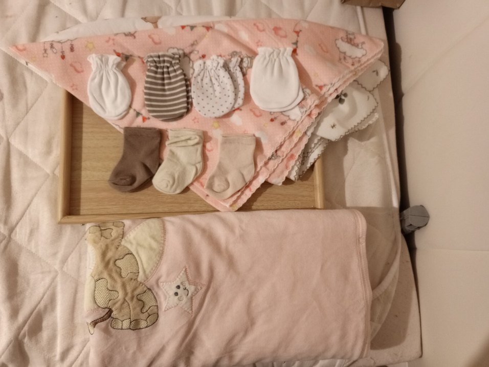 Nakışlı desenlere sahip, pembe ve krem renklerinde yumuşak pamuk çocuk battaniyeleri, sevimli hayvan ve bulut figürleriyle. 2 adet sıfır kullanılmamış polis bebek battaniyesi 1adet soft polar kalın bebek battaniyesi 3 adet 0-6 ay etiketli yeni çorap 4 adet 0-4 ay penye eldiven 6 adet mama önlüğü