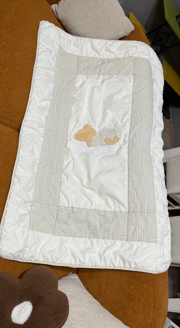 Nakışlı detaylara sahip beyaz ve gri pamuklu bebek battaniyesi, yumuşak dokusuyla rahatlık sağlar.