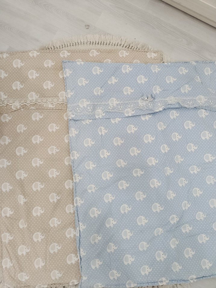 Nakışlı fil desenli, pastel bej ve mavi pamuklu kumaştan oluşan bebek uyku seti, yumuşak ve rahat bir dokunuş sunar. 100-75 boyutunda bebek yorganı fiyat ikisi için geçerlidir.