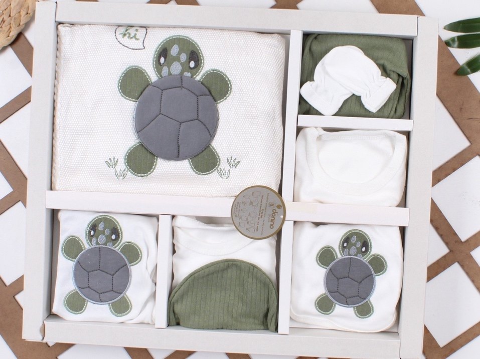 Nakışlı kaplumbağa desenli, yumuşak pamuklu kumaştan yapılmış gri ve yeşil tonlarında bebek uyku seti. Konforlu ve şık birden fazla parçadan oluşur.