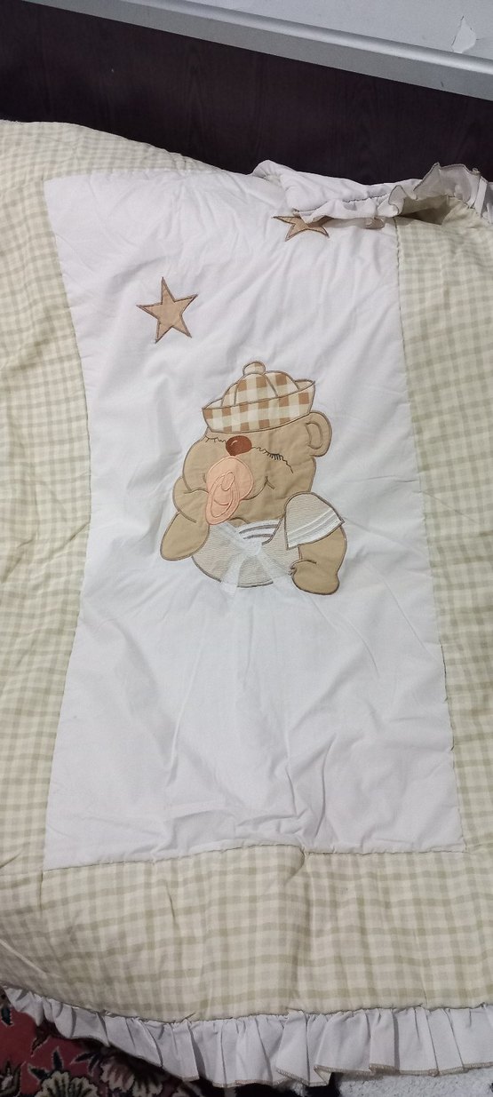 Nakışlı ayıcık ve yıldız desenleriyle pastel tonlarda yumuşak pamuklu bebek yorgan. Bebekler için rahat ve nazik.