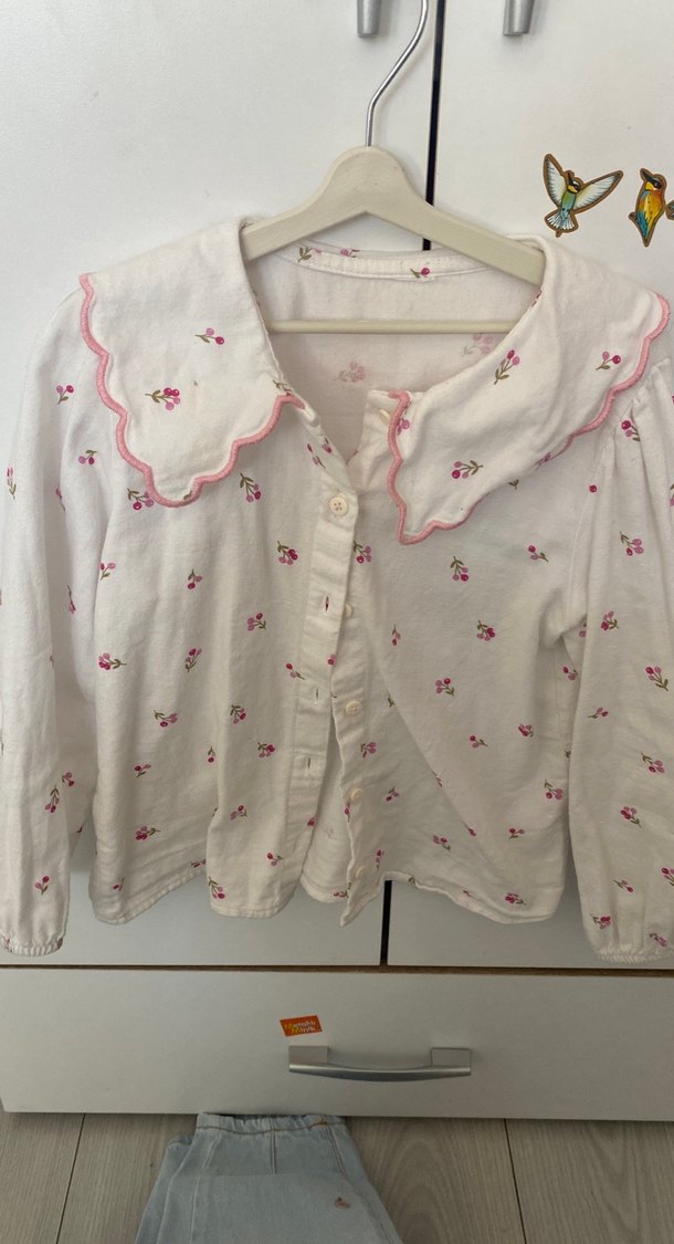 Uzun kollu, düğmeli, beyaz pamuklu kız gömleği. Yakası pembe nakışlı, küçük çiçek desenleriyle bohem ve retro tarzlara uygun.