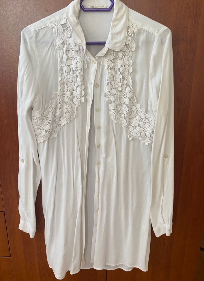 Pamuklu, beyaz, uzun kollu, yakalı ve nakışlı çiçek detaylı tunik.