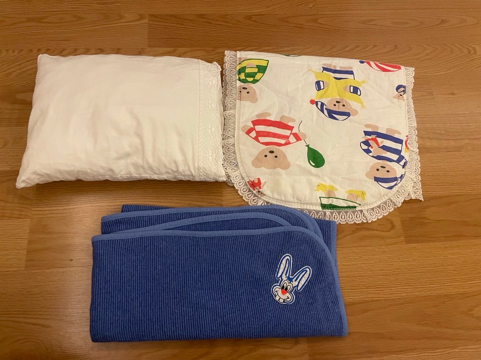 Pastel mavi pamuklu, tavşan nakışlı battaniye, dantelli beyaz yastık kılıfı ve renkli nakışlı yastık kılıfından oluşan çocuk uyku seti. Yumuşak ve rahat malzeme ile konfor sağlar. Yastık kılıf leke var ama bebek yorganı ve battaniye kulanılmadı