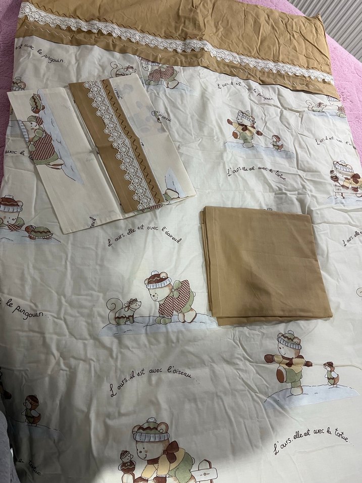 Nakışlı desenlere sahip, yumuşak pamuk kumaştan yapılmış bej tonlarında çocuk uyku seti, yastık kılıfı ve yorgan kılıfı içerir. İçerisindeki yorgan yünden özel olarak yaptırılmıştır hiç kullanılmamıştır
