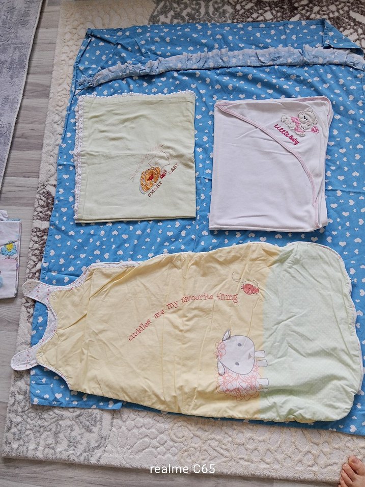 Nakışlı desenlere sahip pamuklu çocuk uyku tulumu ve beyaz puantiyeli uyku tulumu ve iki adet kundaktan oluşan pastel renkli uyku seti.