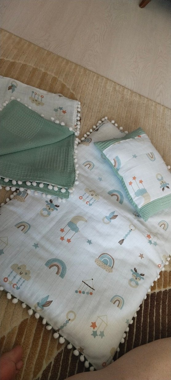 Nakışlı desenlere sahip pastel çok renkli pamuklu bebek uyku seti, dokulu yeşil detaylar ve ponpon süslemeler içerir. etiketlidir ilkim bebe ağız mendili şeyi yani da hediye gonderecegim