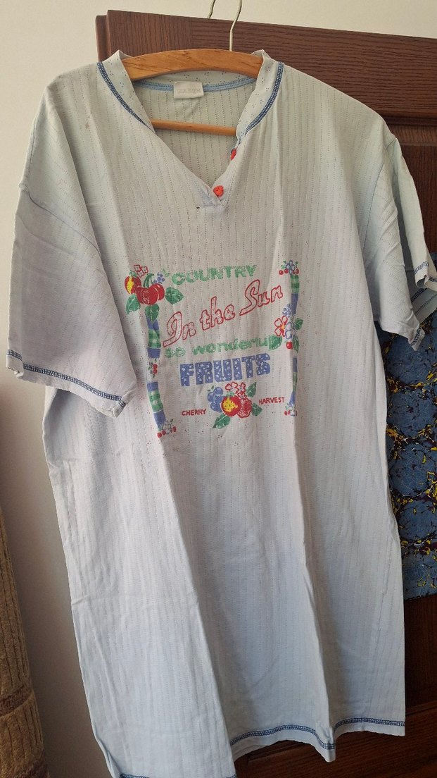 Pamuklu, kısa kollu, nakışlı, düğmeli, bol kesim hamile midi elbisesi. Bohem ve vintage tarzda meyve desenli rahat model.