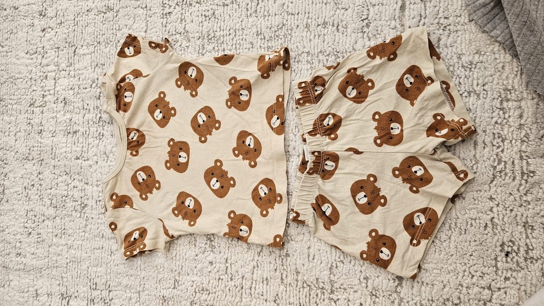 Nakışlı ayı yüzleriyle kahverengi pamuklu çocuk takımı, yumuşak ve rahat bir kullanım sağlar. 6-9 ay