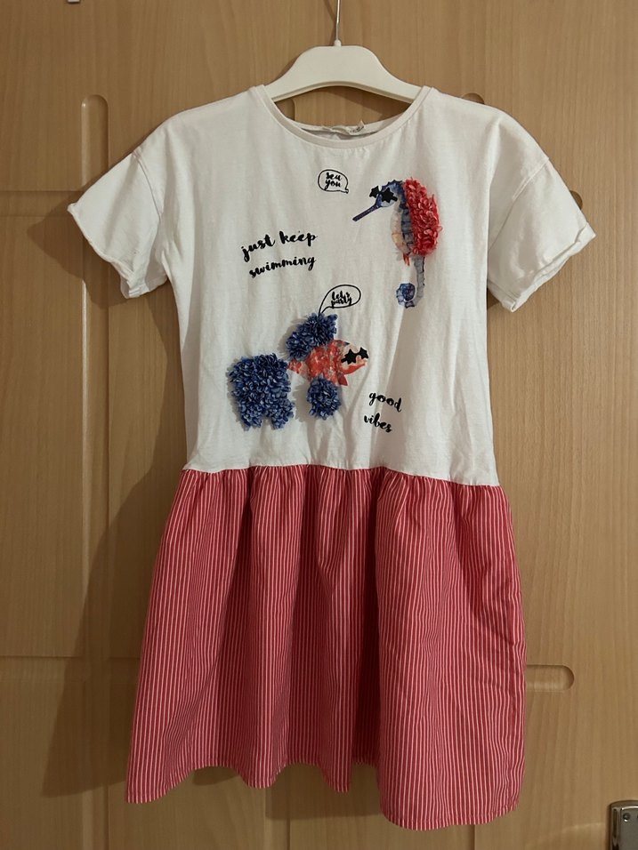 Pamuklu kumaştan, kısa kollu, yuvarlak yaka ve bol kesim kız elbisesi. Nakışlı detaylar ve kırmızı çizgili fırfırlı etek bulunur, rahat ve şık bir sokak stili elbisesi.