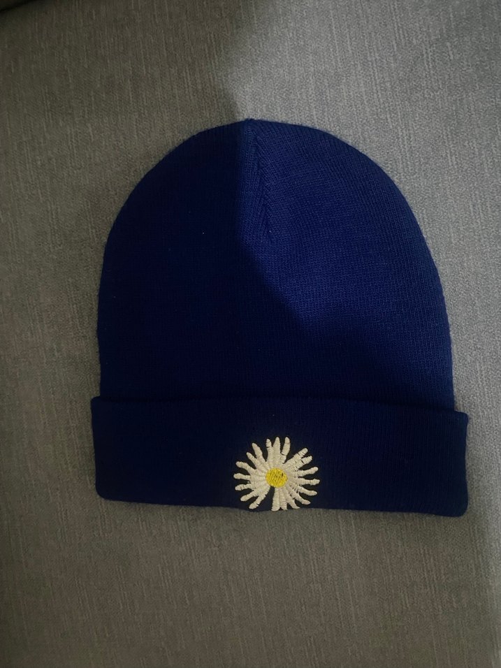 Mavi, nakışlı papatya desenli örgü kadın bere, rahat ve bohem, hippie veya retro sokak stiline uygundur.
