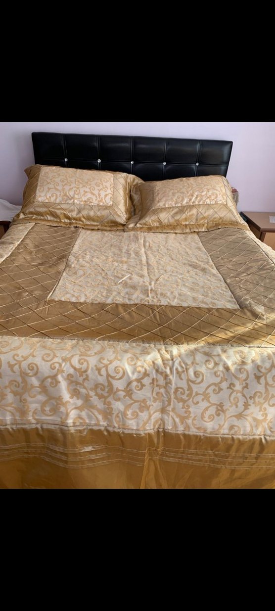 Nakışlı desenlere sahip parlak altın renk yatak örtüsü, yatak odasına şıklık katıyor. Uyumu sağlayan yastık kılıfları ve kapitone detayları bulunur. ️
